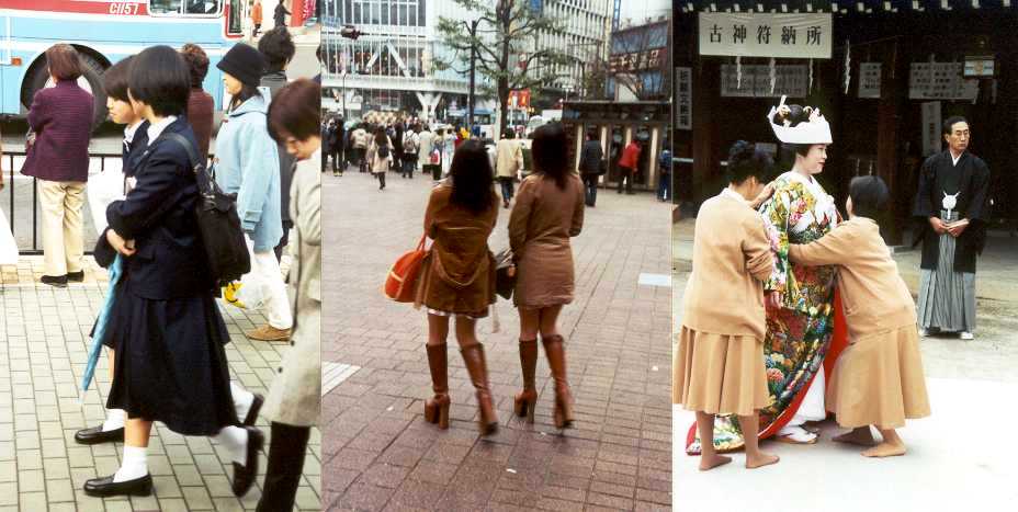 Tre immagini del Giappone femminile: Scolare in divisa di Kamakura, ragazze a passeggio per Shibuya, e vestizione di sposa al tempio Meiji.